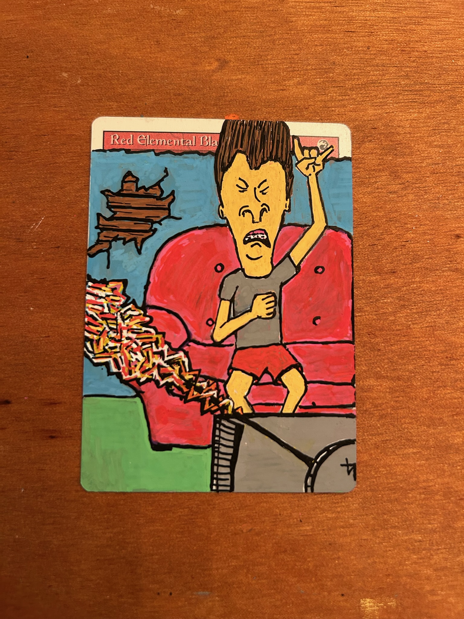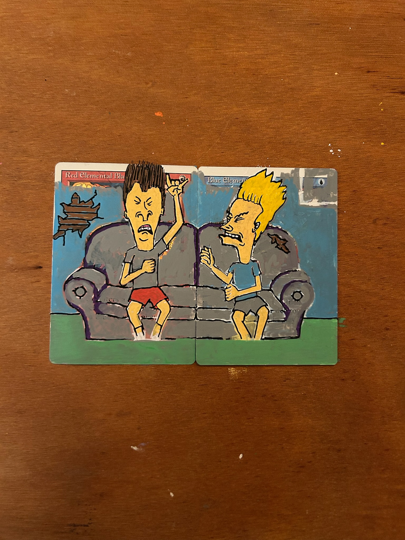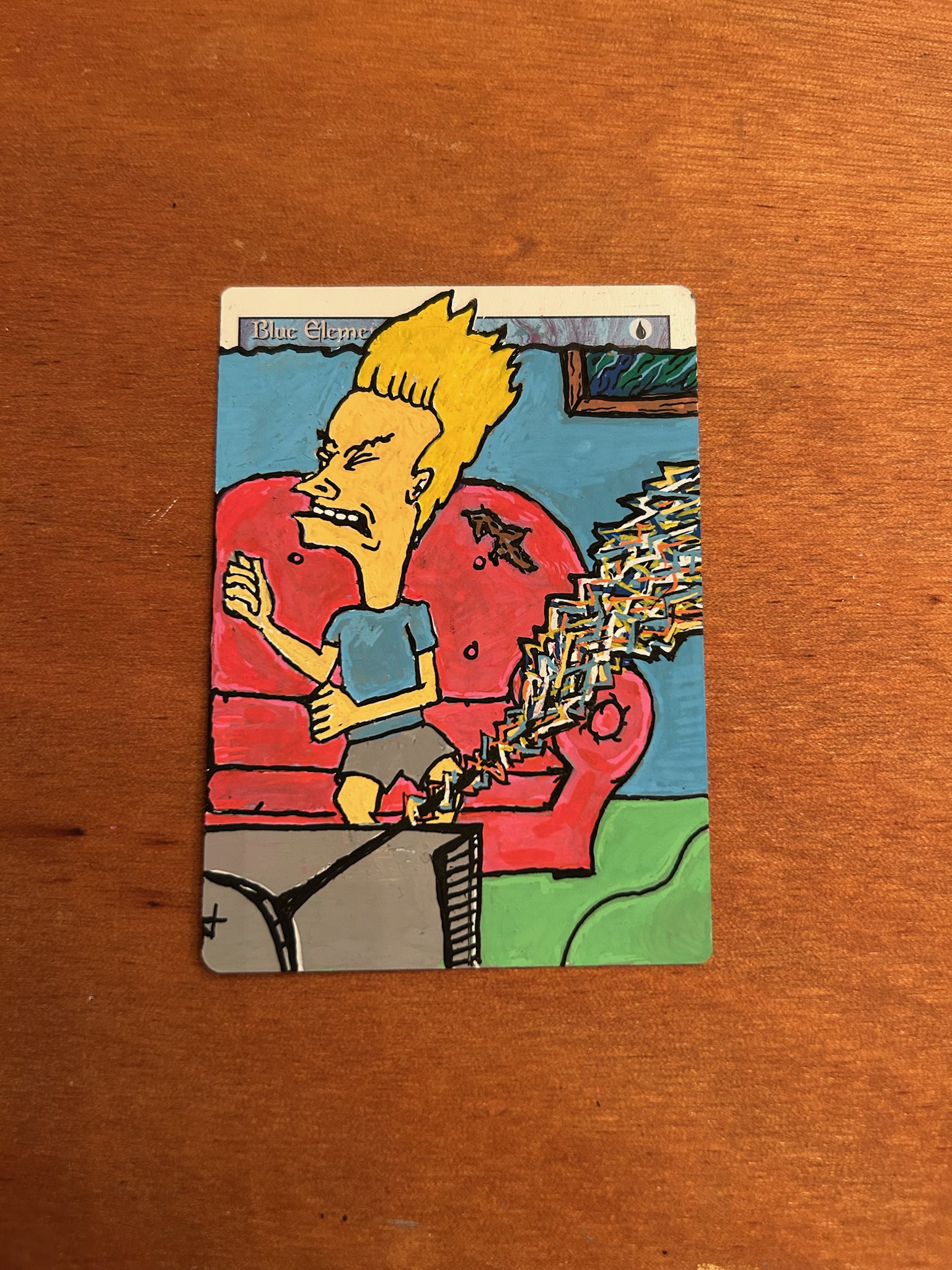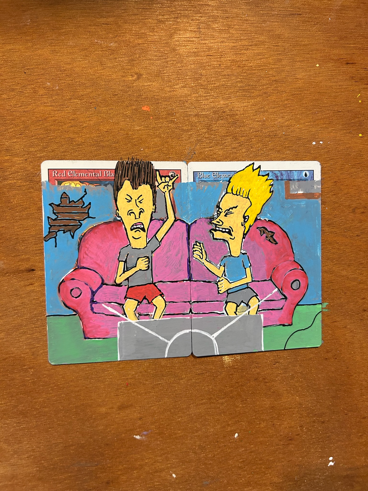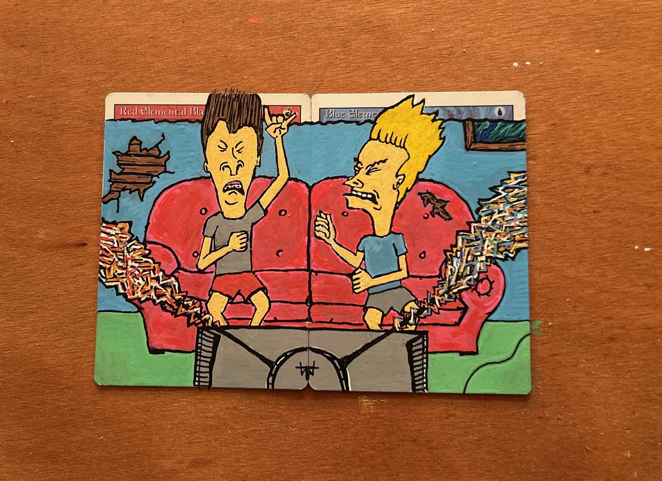 We workshopped a couple ideas but ultimately landed on a 90s throw-back. So I reached for the classic Bevis and Butthead sitting on the couch paired with red and blue elemental blasts emitting from the TV antenna.